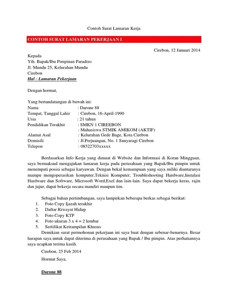 Surat lamaran merupakan surat permohonan yang dibuat oleh para pelamar pekerjaan atau pencari kerja, . File dokumen dalam format docx microsoft word, bisa disave atau di download. Akan tetapi, terkadang kita luput bahwa hal yang esensial bukan hanya soal ketertarikan kita pada pekerjaan yang dilamar. Selain surat lamaran dokumen penting lainnya yang harus disiapkan pada saat melamar kerja adalah daftar riwayat hidup atau curriculum vitae cv. Adapun kemampuan saya yaitu dapat mengoperasikan ms.office (ms.word, ms.excel), dan saya.